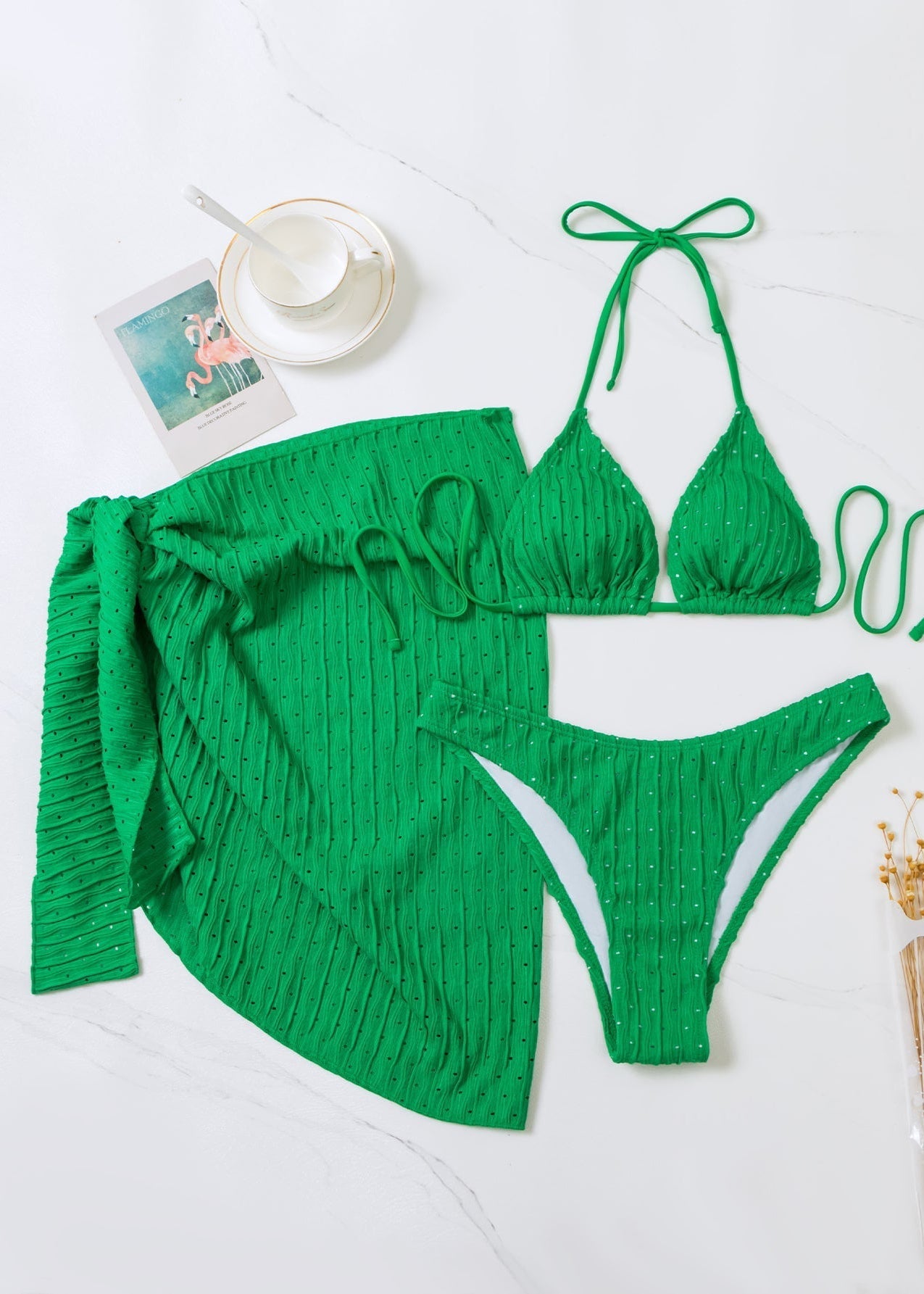 Ce maillot de bain triangle texturé est accompagné d’un paréo assorti pour un look de plage complet, frais et tendance. Parfait pour les journées ensoleillées au bord de la mer ou à la piscine.