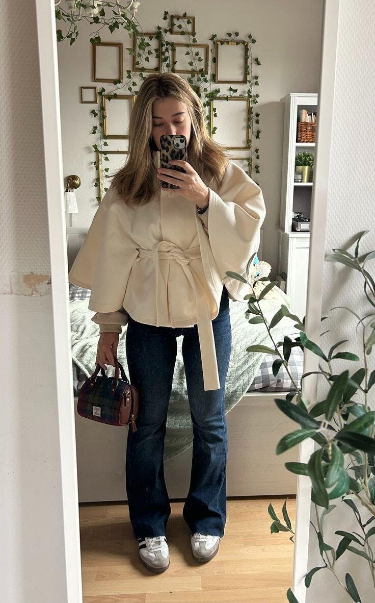 Je suis tombée amoureuse de cette cape ! La coupe est fluide, élégante et la matière super douce. Je la porte presque tous les jours au bureau 💕